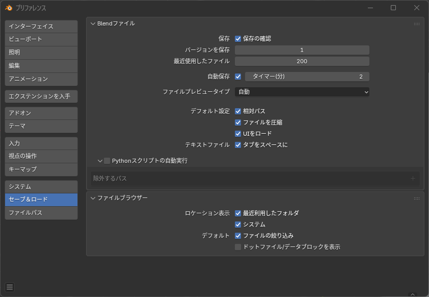 まずはBlenderを開いて、「編集」→「プリファレンス」→「セーブ&ロード」を選択する。