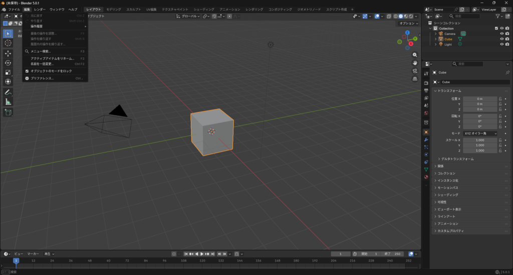 ①Blenderを起動したら、左上の「編集タブ」を開き、「プリファレンス」を選択します