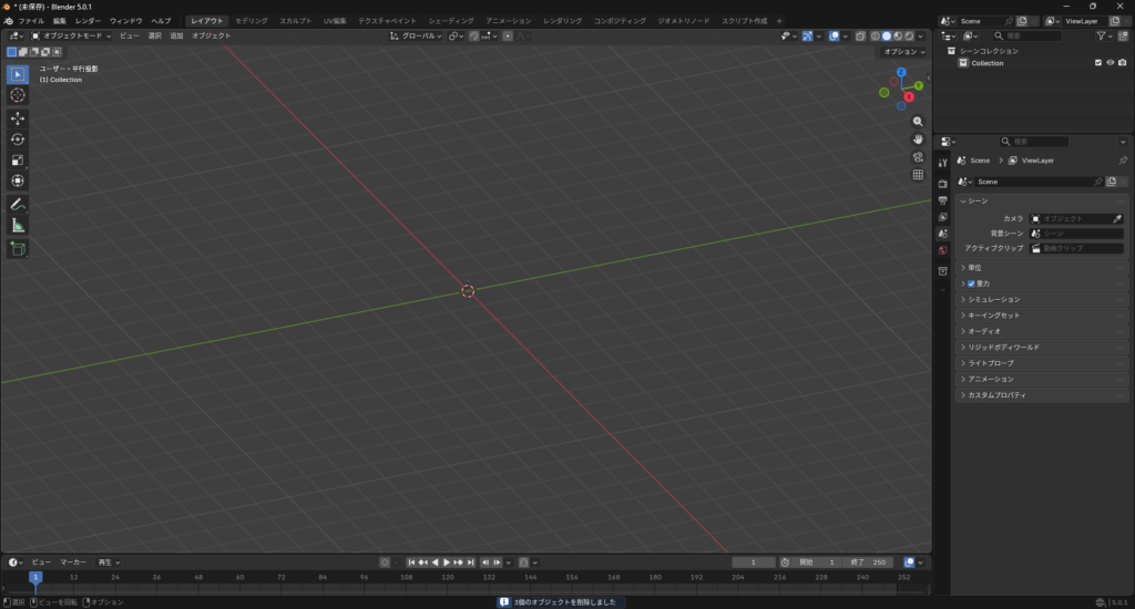 ①「A」→「Delete」を入力し、初期画面に設置されているCamera、Cube、Lightを削除します。その後、「テンキー5」を押して、平行投影に変更します。