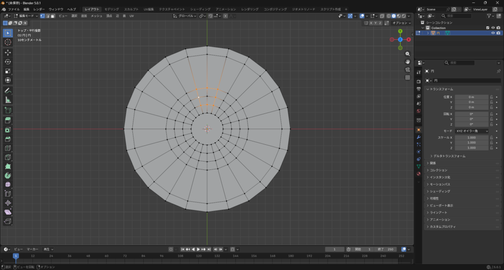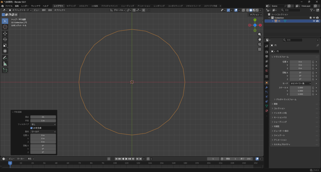 ②「テンキー7」を押して上からの視点に変更します。その後、「Shift+A」→「メッシュ」→「円」を選択して、頂点数を「24」にします。