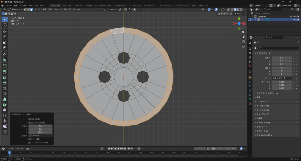 ⑥外側の円を「Alt+クリック」で選択して、「E」→「0.15」でZ軸に押し出します。