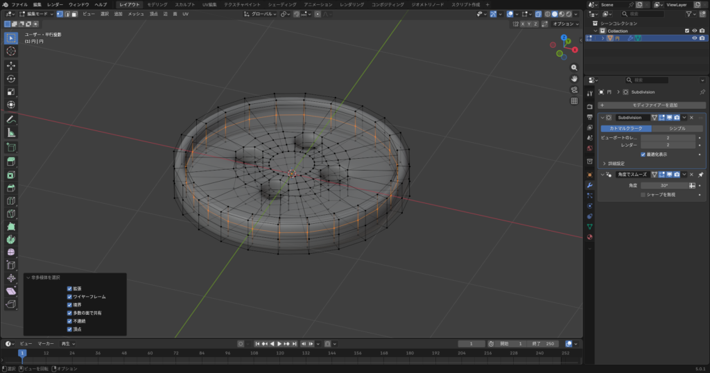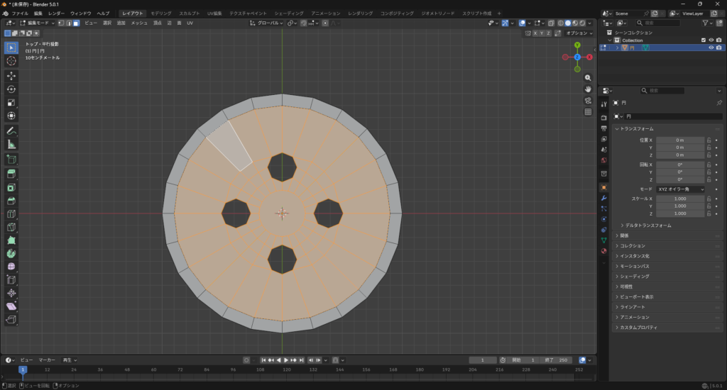 ⑤「3」で面選択モードに移行し、先ほど調整した4つの円の内部を選択し、「Delete」→「面」を選択して穴をあけます。