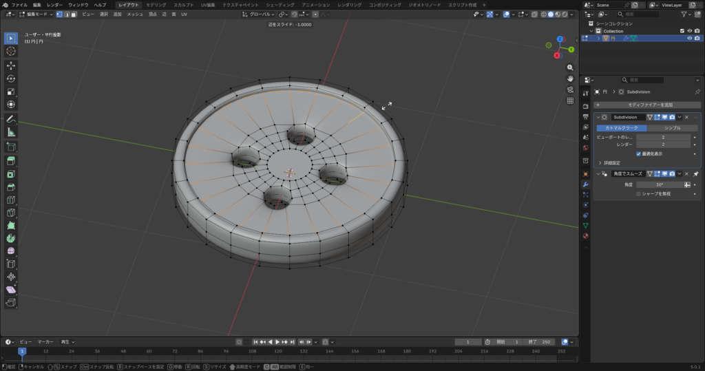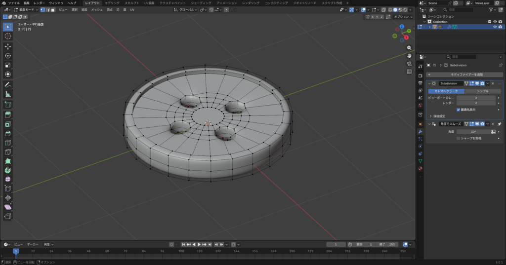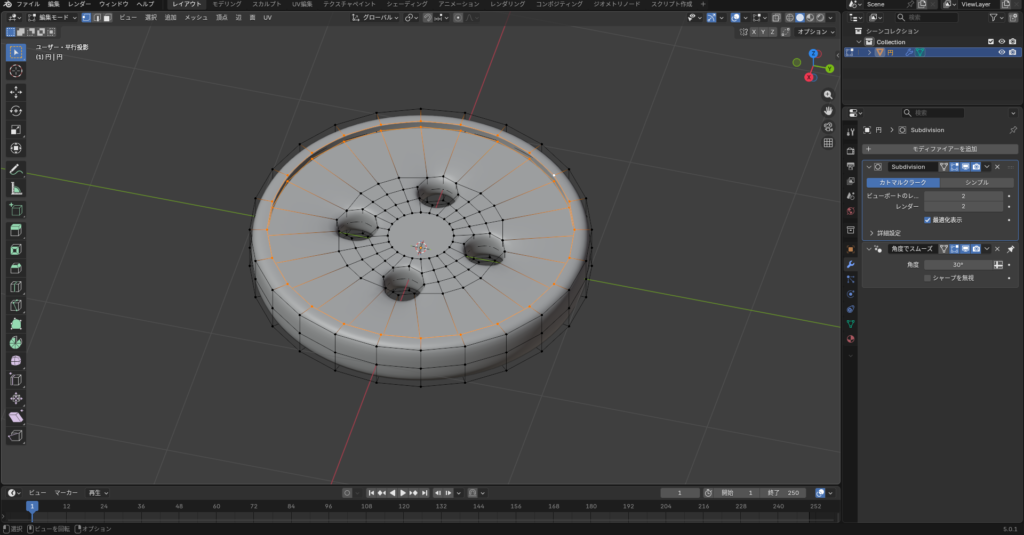 今回のボタンモデリングでのポイントとしては、LoopToolsを使ってきれいな円に頂点を調整したというところでしょう。